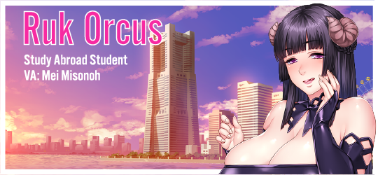Ruk belongs to the Orcus clan, a type of swine succubi who are by far the most esteemed throughout the Succubus Kingdom. She's relatively carefree, a bit of an airhead, and is very curious about the kinds of food the Human Realm has to offer. She has a habit of frequently sharing pictures of whatever she's eating on the Succubus Kingdom's one social media network, Incugram. Ruk is generally friendly and kindhearted, but naively believes Lima is not deserving of the position she's in, and though not out of spite, she will speak ill of Lima at times. She also considers humans to be inferior beings to succubi, but that belief as well, is not one of malice. Her body is pleasantly plump, and her features are gentle--if not maternal. She speaks in a refined manner befitting of someone with such a dignified--albeit sheltered--background, but much of what she says is either foolish or downright silly.